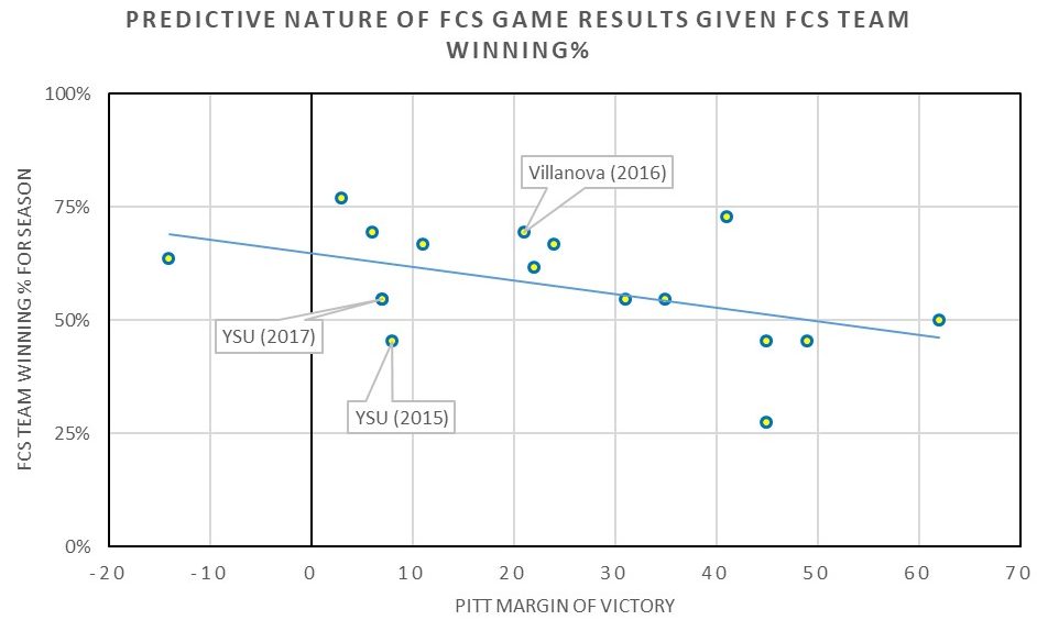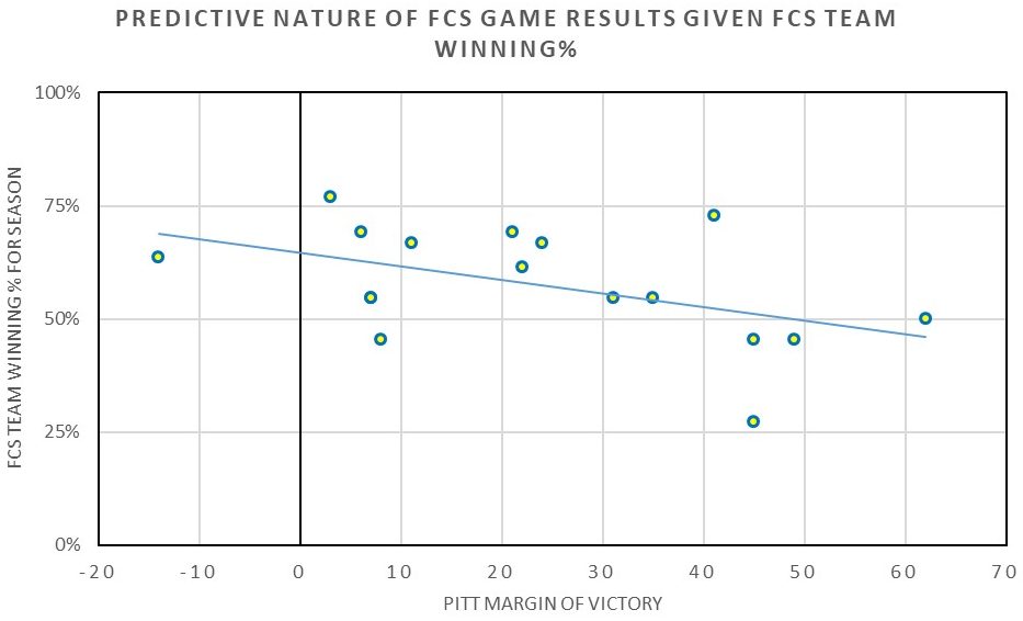 One more thing I want to bring up is this graph which charts every game Pitt has played against FCS competition. The horizontal axis represents Pitt’s Margin of Victory in these games, with the vertical axis representing the FCS team’s final winning percentage in the season in which the game took place. Though an imperfect illustration, these variables can be thought of as measuring the difference in quality of Pitt over the FCS team and how that team stacks up within the lower division respectively. Because of this, we would expect that the closer the margin of victory, the better quality of opponent the FCS team would be. The chart does in fact show this, albeit not to a large degree: