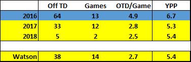 While Watson undoubtedly made some mistakes, it would be ridiculous to attribute Pitt’s entire drop-off in offensive production from 2016 to Watson’s performance due to these reasons. After all, that was a historic offense that featured many vital upper-classmen, including 4 players that were selected in the next year’s NFL draft. However, the decline was incredibly swift and steep. Pitt went from scoring nearly 5 Touchdowns on offense per game to less than 3 and the average yards per play went down over a yard and a half.